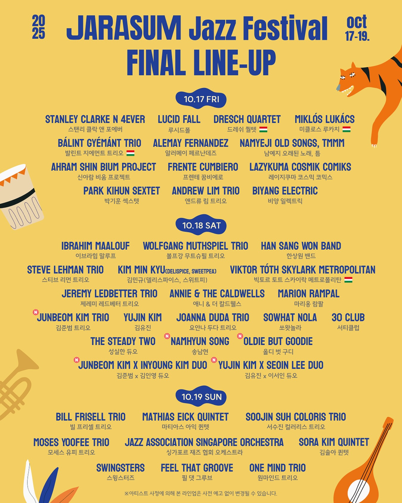공연 일정: 2025년 10월 17~19일 (금~일)공연 장소: 경기도 가평군 자라섬 및 읍내 일대티켓 가격: 1일권 88,000원, 2일권 154,000원, 3일권 198,000원티켓 예매: 예스24