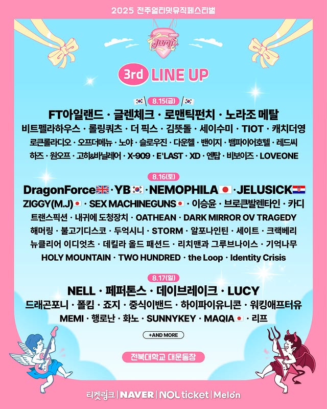 공연 일정: 2025년 8월 15~17일 (금~일)공연 장소: 전북대학교 대운동장티켓 가격(사전예매)- 1일권 99,000원 / 2일권 149,000원 / 3일권 198,000원티켓 예매: 멜론티켓, NOL 인터파크, 티켓링크, 네이버