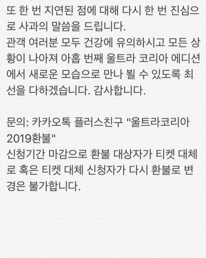 지속적으로 티켓 환불에 최대한 노력을 기울였음에도 불구하고 5월 29일까지 환불 받지 못하신 분들께 진심으로 죄송한 마음입니다.