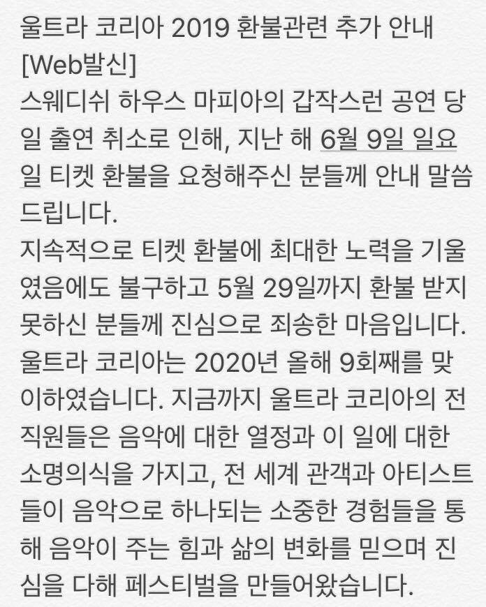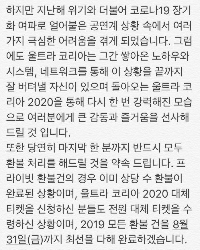 또한 당연히 마지막 한 분까지 반드시 모두 환불 처리를 해드릴 것을 약속 드립니다. 프라이빗 환불건의 경우 이미 상당 수 환불이 완료된 상황이며, 울트라 코리아 2020 대체 티켓을 신청하신 분들도 전원 대체 티켓을 수령하신 상황이며, 2019 모든 환불 건을 8월 31일(금)까지 최선을 다해 완료하겠습니다. 또 한 번 지연된 점에 대해 다시 한 번 진심으로 사과의 말씀을 드립니다.