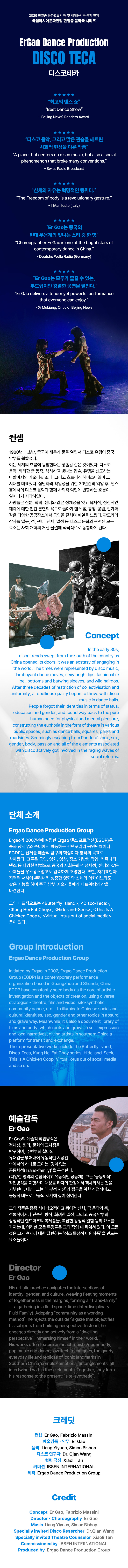 중국 광저우와 순더에서 활동하는 컨템포러리 공연단체 ‘Ergao Dance Production Group’의 공연으로 ‘디스코테카(DISCO TECA)’을 소개합니다.